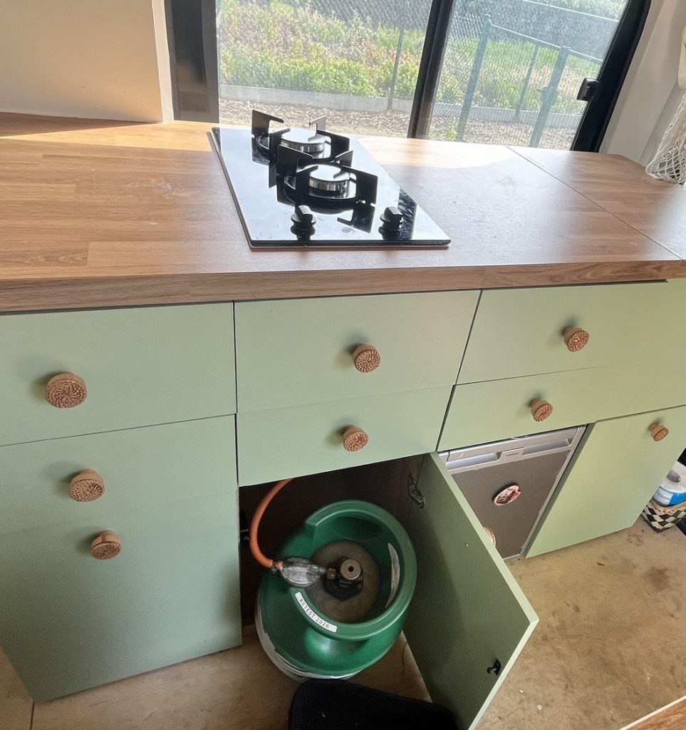 Houd altijd in je achterhoofd dat er voldoende circulatie moet zijn, welke optie je ook kiest! Ik koos bijvoorbeeld om mijn kookplaat boven een lade te plaatsen, zodat hieronder voldoende ruimte is om warmte te laten ontsnappen. Ook moet de gasfles stevig vastzitten en in een afgesloten ruimte zitten. Maar let erop dat er in deze kast een gat/ventilatierooster wordt voorzien om ook in deze ruimte verluchting te creëren.